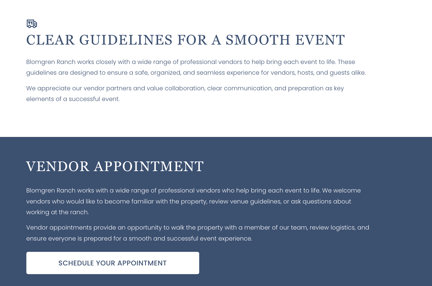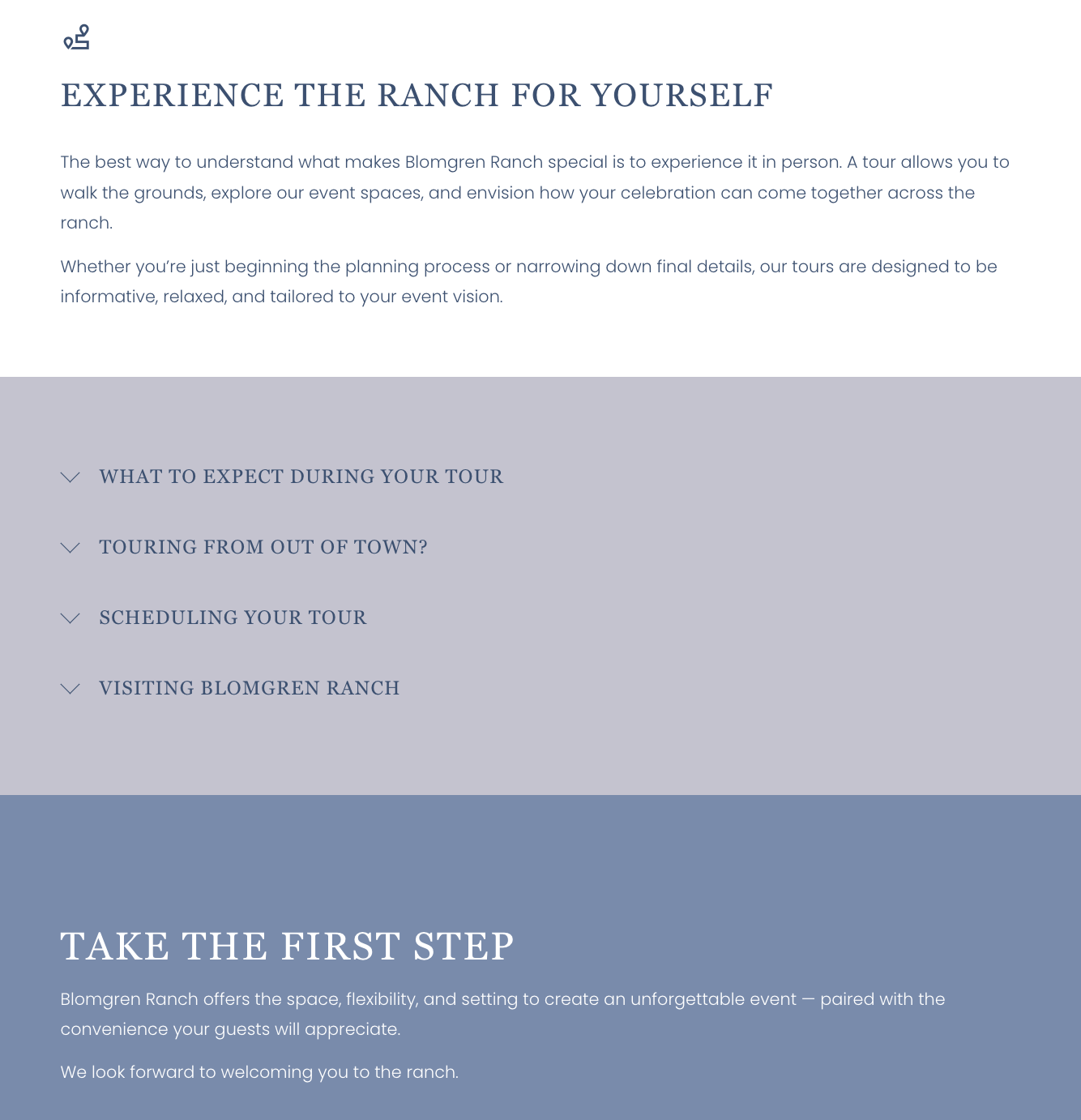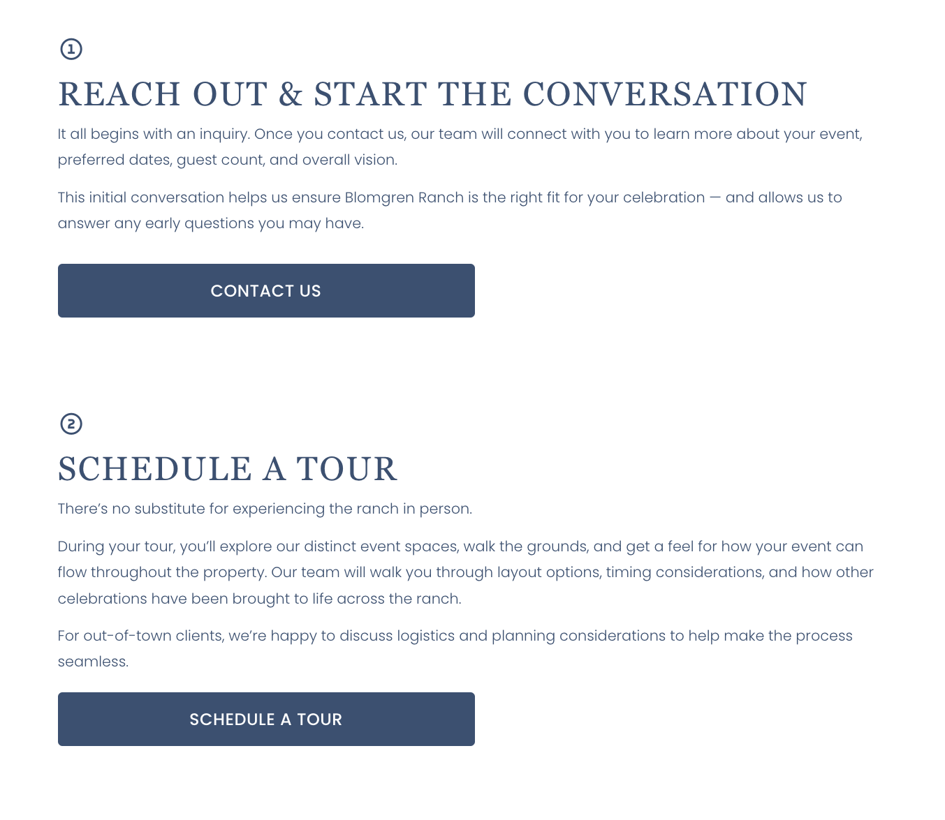 We designed a website that provides clear, accessible information for couples and event planners as they move from early research to scheduling tours, tastings, and booking conversations. The goal was to create a seamless experience that supports both the client journey and the day-to-day operations of the Blomgren Ranch team.